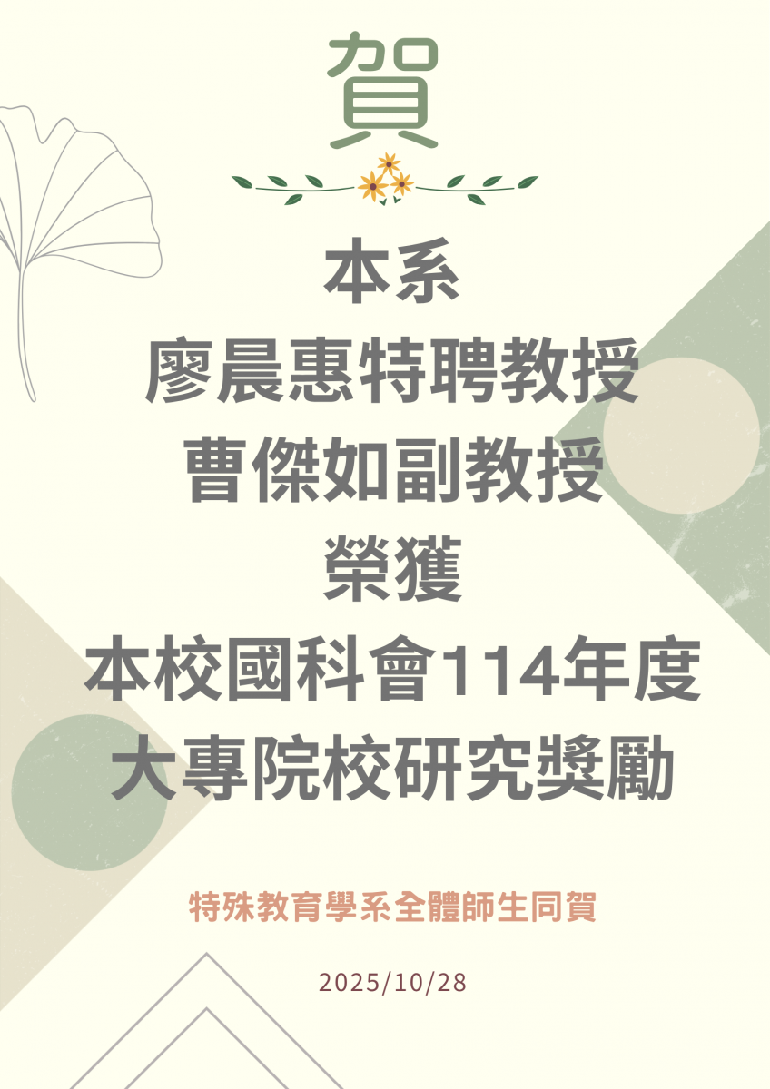 賀!廖晨惠特聘教授、曹傑如副教授國科會114年度大專校院研究獎勵獲獎!!