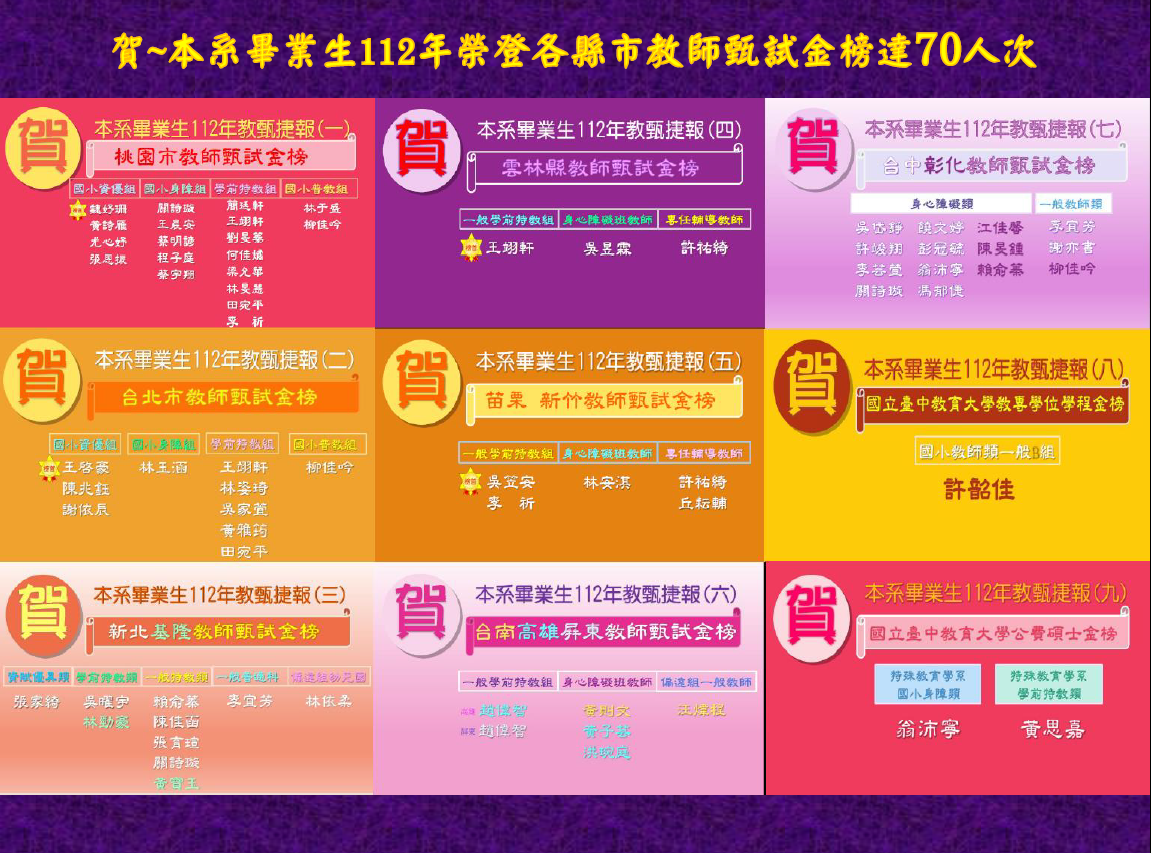 賀~本系畢業生112年榮登各縣市教師甄試金榜達70人次
