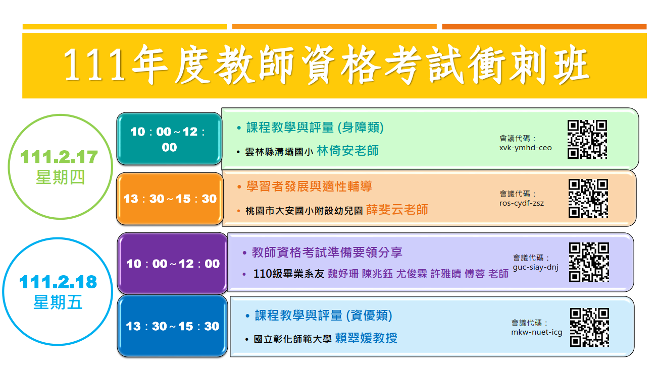 二、111年2月18日上午10時至12時,因故調整由本系110級畢業系友魏妤珊、陳兆鈺,尤俊霖、許雅晴、傅蓉老師講授「教師資格考試準備要領分享」,原定賴翠媛老師講授之「課程教學與評量(資優類)」,調整至下午1時30分至3時30分。
