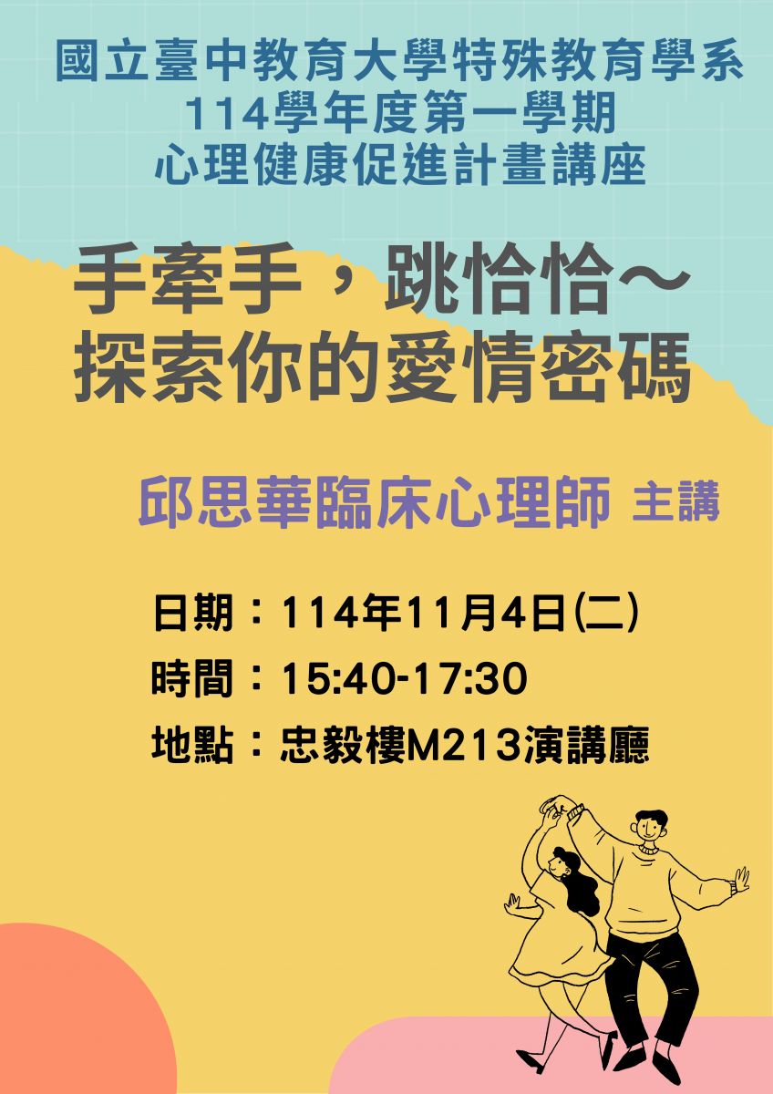 114 年度心理健康促進計畫講座:手牽手,跳恰恰~探索你的愛情密碼