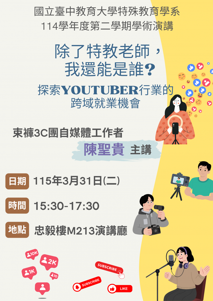 特殊教育學系114學年度第二學期學術演講(一) 時間:115年3月31日 15:30-17:30 主講:束褲3C團自媒體工作者 陳聖貴 講師 講題:除了特教老師,我還能是誰?探索YOUTUBER行業的跨域就業機會 地點:忠毅樓M213演講廳