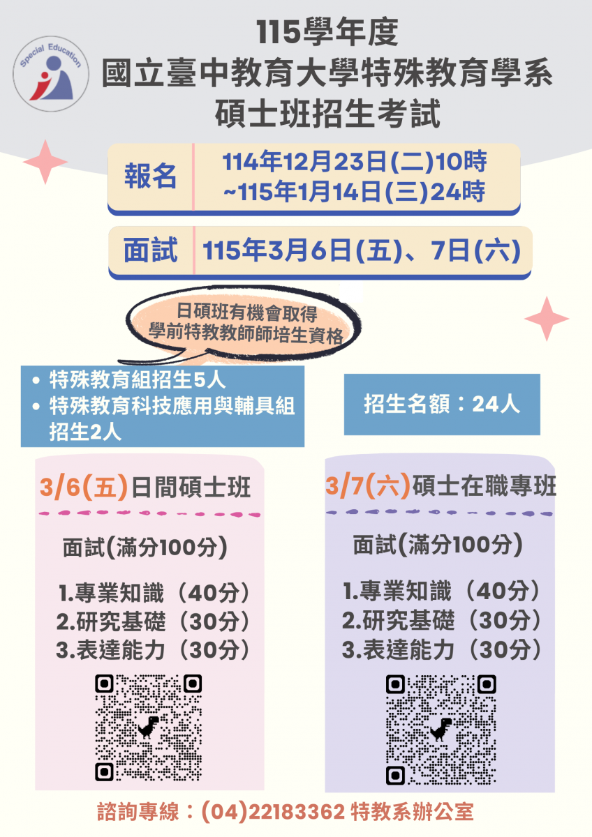 國立臺中教育大學特殊教育學系115學年度碩士班招生考試資訊